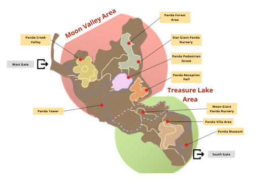 Oltre alle due zone principali, il parco comprende aree dedicate ai panda rossi, separate dai panda giganti, percorsi naturalistici e zone boschive.