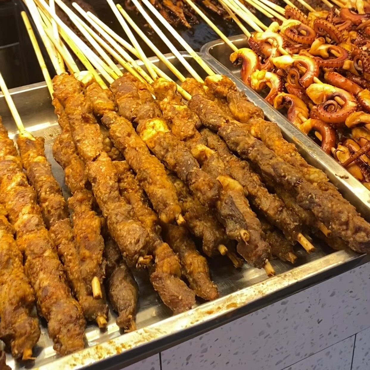 Gli spiedini di carne speziata, sono una pietanza da provare per chi ama i sapori forti. Agnello, pollo o manzo vengono grigliati sul momento, insaporiti con cumino e peperoncino. Piccanti e aromatici, sono perfetti da sgranocchiare passeggiando.