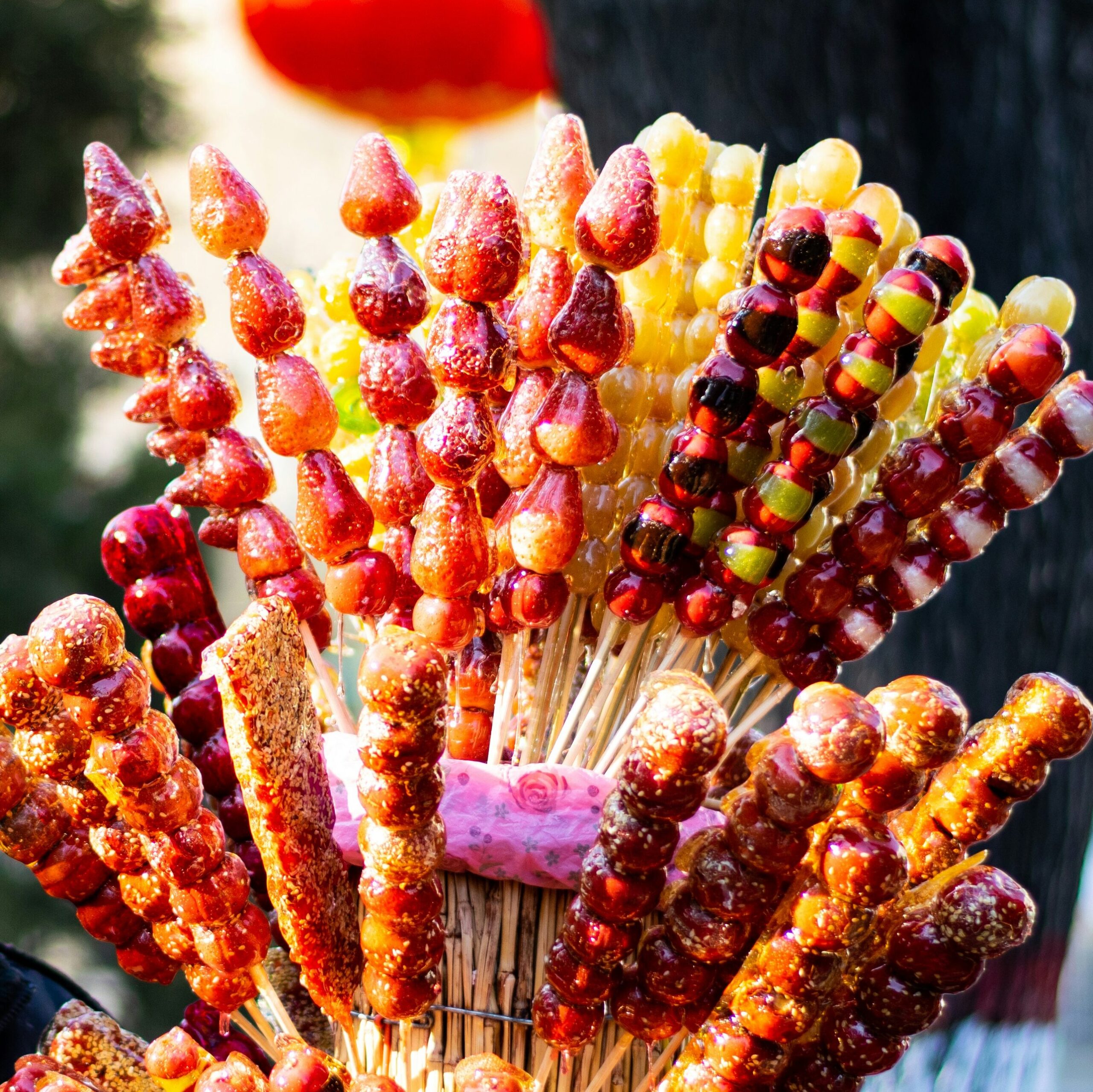 Uno degli snack più pittoreschi dello street food cinese. Si tratta di spiedini di frutta (spesso biancospino o fragole) ricoperti da uno strato croccante di zucchero caramellato. Colorati e dolcissimi, si trovano facilmente al bazar e sono amatissimi dai bambini.
